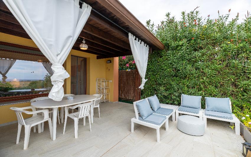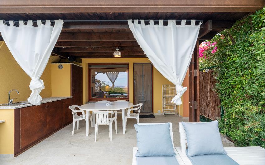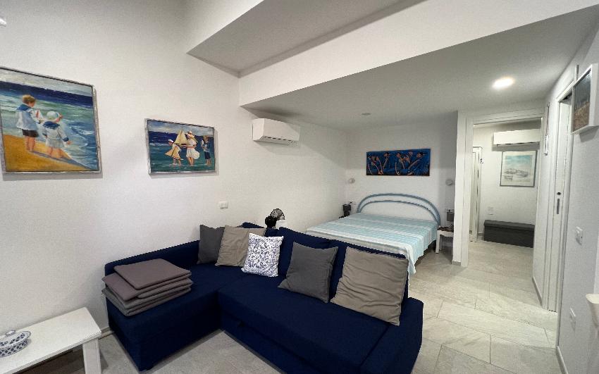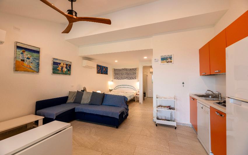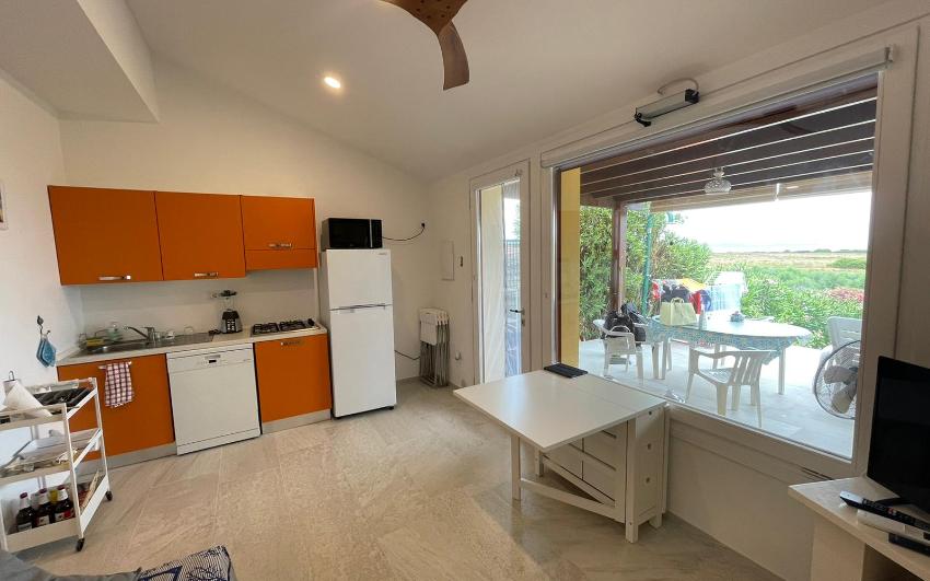 Apartamento panorámico y completamente nuevo de un dormitorio en espacio abierto, muy bien renovado en la planta baja con jardín. Incluye una sala de estar con cocina americana y una cama doble, sala de estar con sofá y TV y dormitorio con una litera. El baño tiene una gran ducha a ras de suelo. La casa está equipada con horno microondas combinado, lavavajillas, lavadora, frigorífico con congelador, TV vía satélite, Wi-Fi, aire acondicionado en todas las habitaciones, patio equipado con vistas al jardín y al mar, barbacoa y aparcamiento reservado.